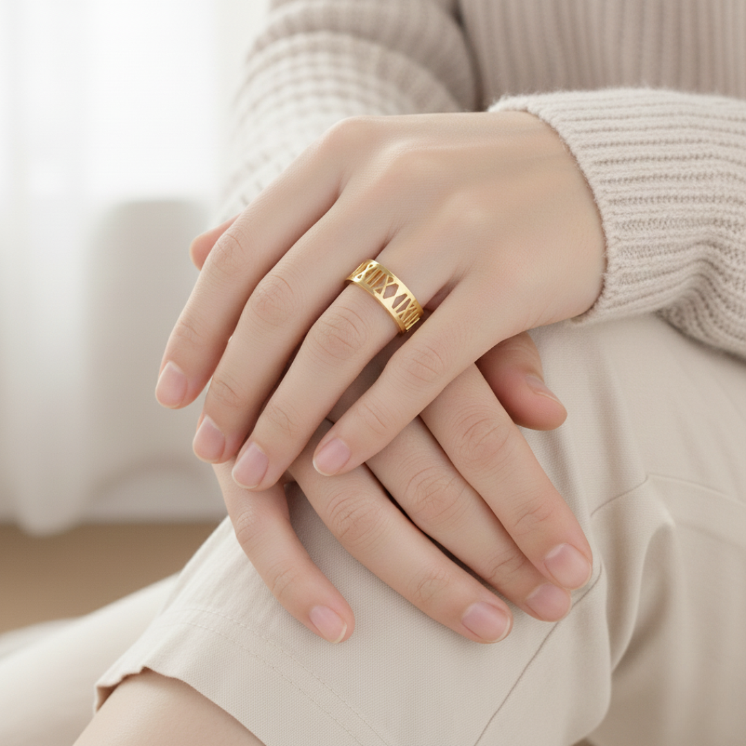 Add a touch of effortless luxury to your look with this Gold Roman Numeral Band Ring by Pyaari Jewellary, designed for women who love timeless style with a modern edge.