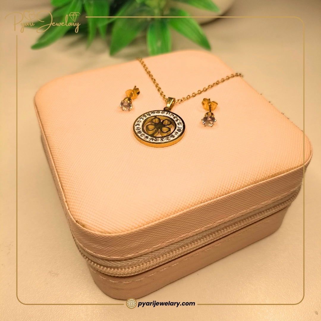 Add sparkle and charm with the Pyari Jewellery Gold Crystal Pendant Necklace & Earrings Set. Featuring a round gold pendant with a delicate floral motif and dazzling crystals, paired with matching stud earrings, this timeless set elevates any outfit with grace and elegance. Perfect for daily wear, office looks, or festive celebrations.