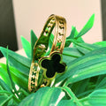 Elegant Design: Beautiful gold cuff bracelet with a chic black clover centerpiece.