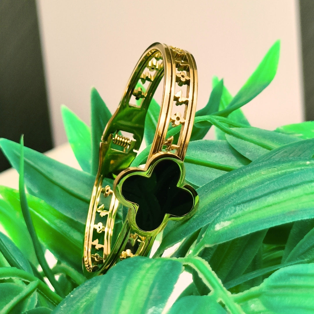 Pyari Jewellery Gold Cuff Bracelet with Black Clover Charm – Elegant Artificial Jewelry for Women