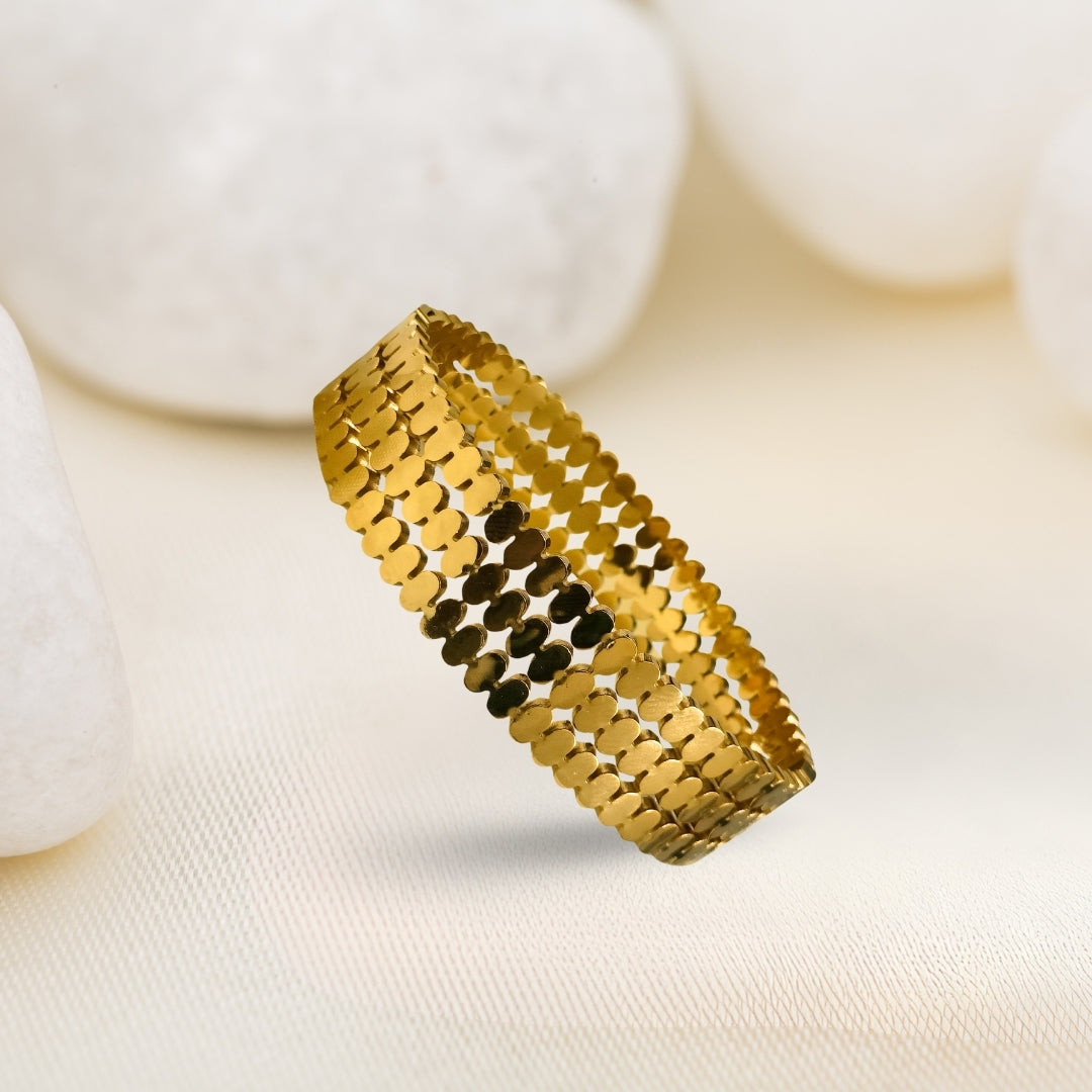 Make a bold and elegant statement with the Pyari Jewellery Textured Gold Statement Bracelet. Featuring layered disc detailing and a flexible expandable design, this premium gold bangle adds glamour and sophistication to any outfit. Perfect for parties, festive occasions, or everyday charm.