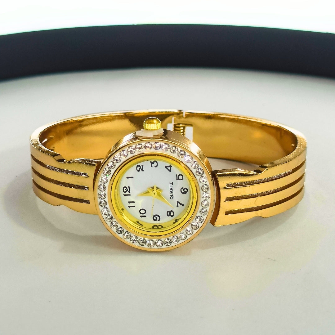 Featuring a beautifully polished gold band and a crystal-embedded round dial, this bracelet watch strikes the perfect balance of class and glamour. The clear numeric display and smooth quartz movement ensure accurate timekeeping while making you stand out wherever you go.
